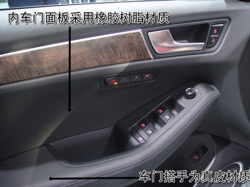 奧迪Q5車門內(nèi)側(cè)拉手采用金屬磨砂處理,提升了視覺效果,并且與車門內(nèi)飾板接縫均勻。內(nèi)門拉手開啟力度適中,回位迅速。