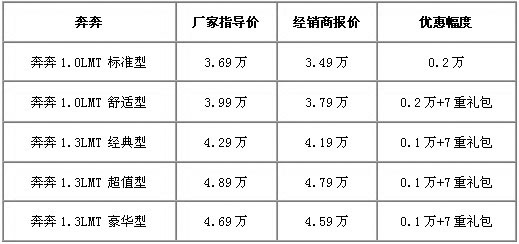 如果說,10萬元左右的緊湊型家用車是合資品牌的必爭之地,那么,5萬元以下的微型車就是自主品牌的天下了。雖然有F0和熊貓、QQ這一系列大敵當前,但奔奔在昆明市場還是占有一席之地的。近日,車天下編輯從云南萬友長安汽車經銷商處獲悉,奔奔系列有1000-2000元不等的現金優惠,同時還可獲得萬友送出的7重大禮包。