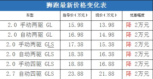 近日,編輯從北京地區綜合經銷商處了解到,獅跑全系的現車充足,基本上可以滿足消費者在春節期間的需求;目前購車全系可以優惠2萬元現金,性價比很不錯。據經銷商透露,消費者要想以這個價格提車,需要在店內做購車一條龍服務,其中車輛四項基本保險可以打8.5折(約合4500-6300元左右)。以下是獅跑最新價格變化表: