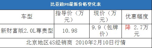 近日,編輯從北京地區(qū)比亞迪4S經(jīng)銷(xiāo)商處了解到,近期比亞迪F6有2.0L尊貴版現(xiàn)車(chē)(黑色、銀色)。目前這款車(chē)在店內(nèi)正在組織消費(fèi)者團(tuán)購(gòu)活動(dòng),車(chē)輛全款(包括購(gòu)車(chē)一條龍和購(gòu)置稅、上牌)為9.9萬(wàn)元,并且贈(zèng)送價(jià)值1000元的汽車(chē)裝飾,相當(dāng)于優(yōu)惠了2.7萬(wàn)元左右。以下是比亞迪F6最新價(jià)格變化表: