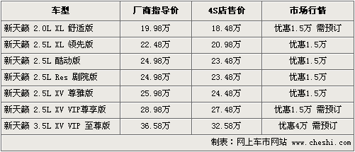 據(jù)東風(fēng)日產(chǎn)4S店銷(xiāo)售人員介紹,目前新天籟3.5車(chē) 型的優(yōu)惠最高可以達(dá)到4萬(wàn)元,其余車(chē)型均可以享受到1.5萬(wàn)元的現(xiàn)金優(yōu)惠,入門(mén)級(jí)車(chē)型優(yōu)惠后售價(jià)為18.48萬(wàn)。目前銷(xiāo)售以2.5車(chē)型為主,2.0車(chē)型、 2.5高配車(chē)型和3.5車(chē)型都需要預(yù)定,訂貨周期在1-2周時(shí)間左右。現(xiàn)車(chē)顏色方面以黑色、銀色為主。由于各店的訂單不同,各店銷(xiāo)售的車(chē)型和顏色有所不 同。