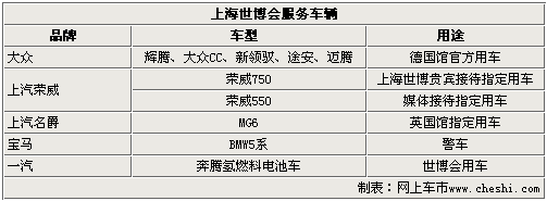除了在展館內展出的新車,各大汽車廠商也對組委會和場館提供了服務用車。自2008年成為北京奧運會官方用車合作伙伴之后,大眾汽車在即將開幕的2010年上海世博會中,成為德國國家館官方用車合作伙伴,將頂級豪華轎車輝騰等6輛官方用車正式交付給上海世博會德國國家館。上汽榮威旗下的榮威750和550則成為了世博會貴賓指定用車和媒體制定用車。寶馬公司則提供的22輛530Li轎車將納入交警總隊警務開道車隊,為世博會期間迎送貴賓擔負起安全保障工作。