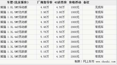 據吉利汽車4S店銷售人員介紹,吉利熊貓目前現車比較齊全,1.0L車型依舊僅有功夫版有現車,購車可享1000元現金優惠。1.3L手動檔和自動檔車型均有現車,自動檔全系優惠2000元,手動檔除了樂動版外其他車型優惠2000元,樂動版優惠3000元。