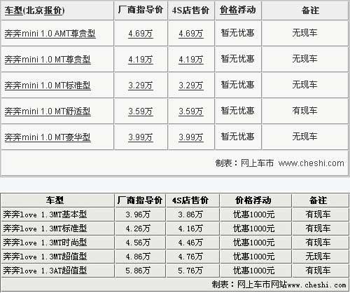 長安奔奔系列在國內(nèi)微型轎車市場可算是家喻戶曉,隨著系列產(chǎn)品的不斷繁衍,目前該品牌系列共推出了奔奔i、奔奔love和奔奔mini三款車型。目前奔奔I車型已經(jīng)全面停產(chǎn),其他兩款車型繼續(xù)在國內(nèi)小型車市場打拼,由于車型定位年輕,關(guān)注度也十分高。網(wǎng)上車市最近走訪了長安汽車北京地區(qū)4S店,對奔奔love和奔奔mini兩款車最新的市場情況進行了了解,具體信息請參考下表: