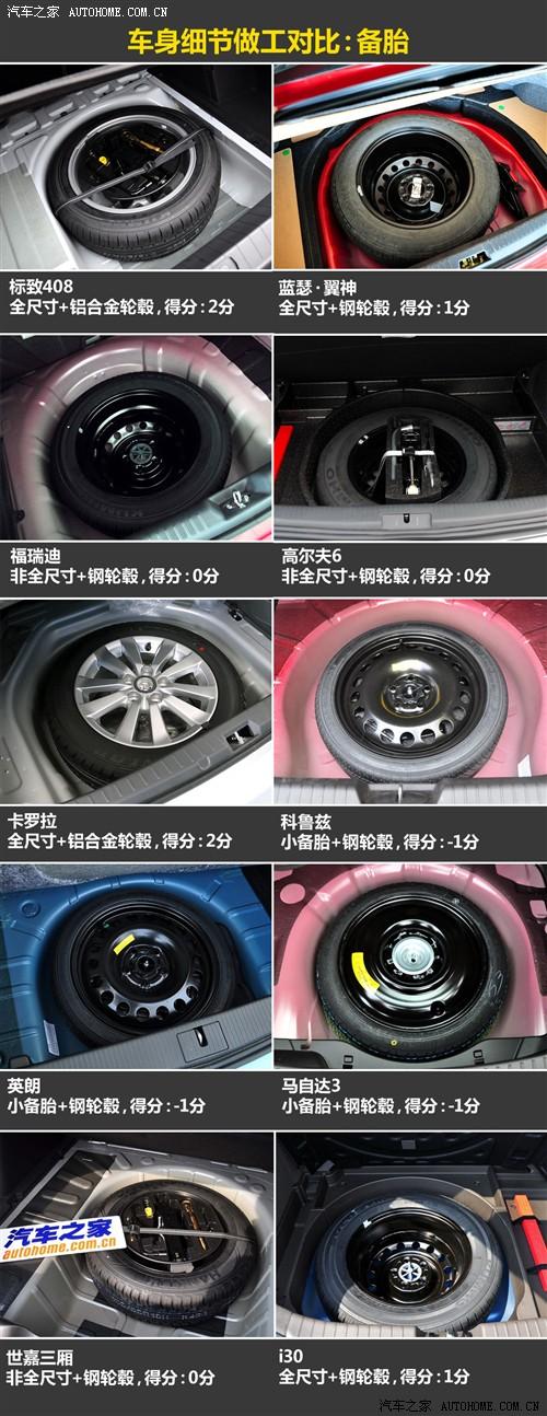 在這一環(huán)節(jié)的對(duì)比中,只有標(biāo)致408和卡羅拉使用了難得一見(jiàn)的鋁合金輪轂,其實(shí)408的低配車型使用的也是鋼輪轂。其他大部分車型都是鋼輪轂和非全尺寸備胎,其中值得商榷的就是福瑞迪,他全系都是195mm或者205mm的輪胎,但備胎卻都是185mm,原因當(dāng)然是為了節(jié)約成本。同時(shí),科魯茲、英朗和馬自達(dá)3兩廂使用的小備胎對(duì)于使用有一定的影響,我們必須扣分。