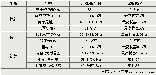 在眾多SUV車型的的范圍中,我們精選了10款各種具有獨特代表性的車型作為對象,其中囊括的日系、韓系和歐美車型,這樣更具有市場針對性,車型的價格范圍也從40萬波及至80萬元。整體呈現出事態強烈的各種狀態,優惠幅度最大的是寶馬X3車型,最高優惠8.6萬;而在天平的另一端,加價最高的是別克昂科雷和卡迪拉克新SRX,加價額度均為3萬元。當然也有不加價的車型分別是豐田FJ酷路澤和起亞霸銳。