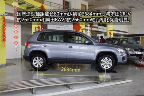 國產版的途觀應用了美版新款車型的前臉造型,也就是現在的大眾家族臉譜——復古式水平中網設計。除了前臉與進口國內的Tiguan不同外,為了適應國內消費者的使用習慣,國產途觀還進行了相應的拉長,軸距達到了2684mm,相比海外版長了80mm。