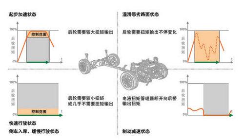 只要仔細看看廠商網站上四驅系統的扭矩輸出圖就不難看出了:在大多數高速行駛,或是倒車入庫、緩慢行駛的時候,途觀為了油耗考慮,后輪扭矩分配為零,就是作為一款前驅車而存在的,只有當起步加速時,或是前輪打滑需要后輪驅動脫困時,才會分配扭矩給后輪,以獲得更好的加速性能或是道路通過性。這明明就是一套適時四驅結構,卻要扯上虎皮裝成“智能全時”!