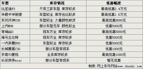 我們這次選擇了10款市場上銷售火爆的自主品牌車型,比如比亞迪F3、駿捷、奇瑞QQ3等車型。通過對北京市場的調查發現,東南V3菱悅CVT、騰翼C30等新車型上市后,現車都能很快進入終端市場,而且出現了一定的優惠幅度。而比亞迪F3、駿捷等熱銷車型,也隨著新老產品的更新換代,庫存壓力變大,從而使優惠幅度也變的更多。