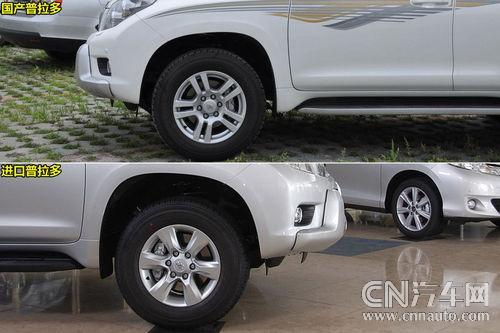 功能配置差異:此外,國產(chǎn)車型增添配置了電動調(diào)節(jié)座椅,電動調(diào)節(jié)方向柱,座椅加熱功能,智能感應(yīng)鑰匙一鍵啟動系統(tǒng),電動天窗等等。普通車型音響系統(tǒng)采用6碟CD和9個(gè)揚(yáng)聲器,而兩款NAVI車型則采用了更高的6碟DVD和14揚(yáng)聲器配置。不同于進(jìn)口車型的265/65R17輪胎,國產(chǎn)高配VX車型配置更加美觀的18寸五輻條雙叉臂鋁合金輪轂和265/60R18鄧祿普GTANDTREK系列AT22輪胎。