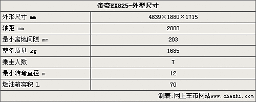 從帝豪EX825的車型尺寸來看,這款大型SUV的車長達到了4839毫米、寬度為1880毫米、高度為1715毫米。而且這款車的軸距也達到了2800毫米,采用7座的設(shè)計,從這些數(shù)據(jù)來看,這款新車不僅是以豪華為主要設(shè)計方向,也注重了整車的實用性。