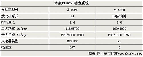 在動力方面,帝豪EX825將搭載兩款發(fā)動機,其中一款為2.4L排量的汽油發(fā)動機,最大功率可達118千瓦,而且在4000轉(zhuǎn)的時候即可迸發(fā)出220牛.米的扭矩。這款車型可以匹配六速手動變速箱,還可以配備吉利研發(fā)的7速雙離合變速器。另外,這款車還搭載了2.0L柴油發(fā)動機,在4000轉(zhuǎn)的時候就可以達到100千瓦的最大功率,1800轉(zhuǎn)的時候的扭矩就可以達到286牛.米,低轉(zhuǎn)速的動力表現(xiàn)著實不錯。