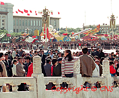 參加50年國慶游行的大型彩車擺放在天安門廣場上,十月二日數(shù)以萬計的游人從北京各處涌向這里,一睹節(jié)日廣場的風(fēng)采。
