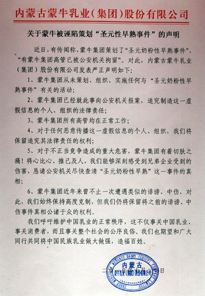 在蒙牛公司發表的題為《關于蒙牛被“誣陷”策劃“圣元性早熟事件”的聲明》一文里,蒙牛公司稱,“蒙牛集團從未策劃、組織、實施任何與圣元奶粉性早熟事件有關的活動”;“蒙牛集團所有高管均正常工作”。