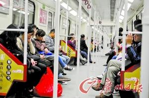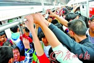 4日的體育西路站,車廂內的乘客擁擠不堪。記者喬軍偉攝