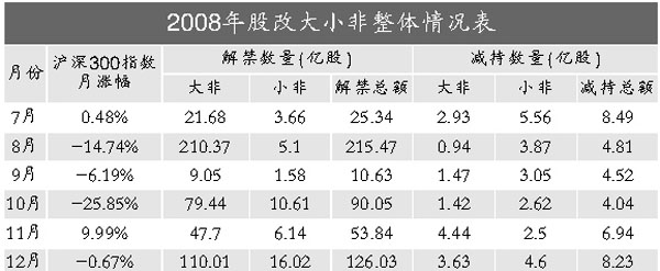 數(shù)據(jù)顯示,去年12月兩市共產(chǎn)生股改解禁股126.03億股,其中大非為110.01億股,小非為16.02億股,從滬深兩市來看,滬市解禁數(shù)量為79.94億股,深市解禁46.09億股。而當月大小非減持數(shù)量高達8.23億股,比去年11月份減持量增加15.6%,比去年7~12月平均每月減持量多出2.06億股,創(chuàng)出去年8月份以來的新高,僅比去年7月大小非減持最高峰少了0.26億股。