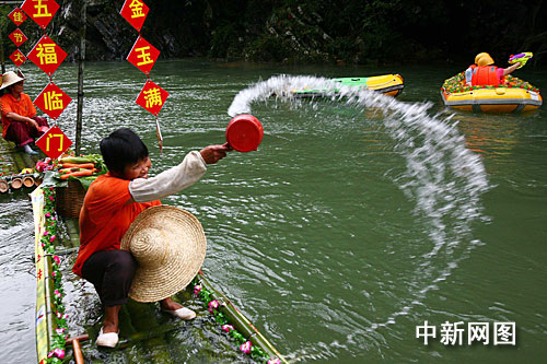 中新網(wǎng)廣州5月26日電(記者 莫非 通訊員 慧子)十多艘用竹作為材料扎制成的龍舟,長(zhǎng)3.8米,寬1米,前方高翹,呈龍頭形狀,并且四周遍插五顏六色的鮮花,游客在船上打水仗、潑水、沐午時(shí)水,歡笑聲不斷。而漂亮的花龍舟從廣州流溪河源頭順流而下,徜徉在從化響水峽的漫天花海中,格外壯觀。