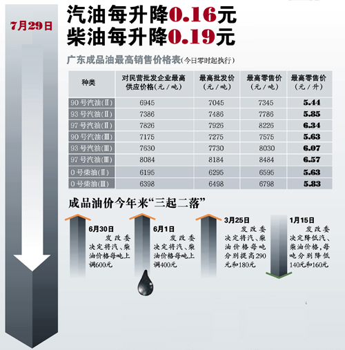 隨后,省物價局根據(jù)國家規(guī)定,也制定公布了廣東省的成品油銷售價格。這也是全省成品油價格繼6月份一個月內連續(xù)2次上漲之后,首次出現(xiàn)下調。降價的幅度從0.16元/升~0.20元/升不等,其中國Ⅲ標準97號汽油降價最多,降價后每升最高零售價為6.57元。