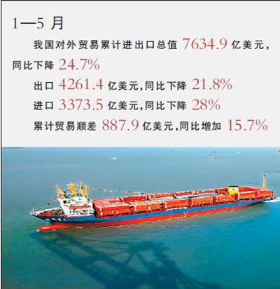 在內(nèi)需呈現(xiàn)升溫態(tài)勢的同時,外需仍然持續(xù)萎縮。據(jù)海關(guān)統(tǒng)計(jì),5月份當(dāng)月,我國進(jìn)出口總值1641.3億美元,同比下降25.9%,降幅比今年前4個月累計(jì)同比降幅加深1.5個百分點(diǎn)。其中出口887.6億美元,降幅加深5.9個百分點(diǎn),進(jìn)口753.7億美元,降幅收窄3.6個百分點(diǎn)。
