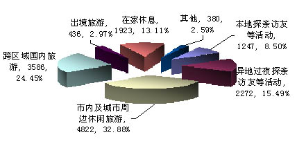 調查結果顯示,57.33%的受訪者計劃在國內旅游,其中:32.88%受訪者有意在市內及城市周邊休閑旅游,24.45%的受訪者有意跨區(qū)域國內旅游;2.97%的受訪者計劃出境旅游;23.99%的受訪者有意探親訪友,其中:15.49%的受訪者計劃異地過夜探親訪友;13.11%的受訪者計劃在家休息。