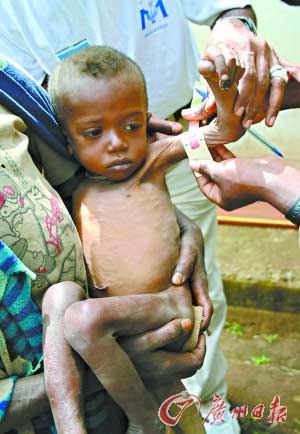 圖:埃塞俄比亞一營(yíng)養(yǎng)不良的兒童在接受醫(yī)療人員的診治