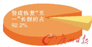 據了解,兩會以來,已有數十名代表委員在兩會的各個場合為“五一”黃金周大聲疾呼。而在網上的調查中,網民對恢復“五一”黃金周的提議支持率也很高,在人民網“你是否贊成恢復‘五一’長假”的調查顯示,共有500多萬名網友參與了網上調查,其中贊成恢復“五一”長假的占92.2%。