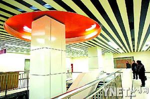 “太空艙”———這是記者對“金臺夕照”站廳裝修的直接印象。寬闊站廳內,兩側墻壁如括號般向內彎曲形成類似機艙的形狀。除了地面之外,無論墻壁還是天花板,圓形白光燈池和橘紅色色塊如密集的氣泡一樣分布,大的直徑可達1米,小的直徑才20厘米左右。面對如此現代風格的設計,“金臺夕照”仿佛被賦予了新的生命。