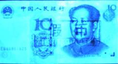 假鈔用紙均為一般社會化用紙,不含棉纖維,光滑、綿軟、無韌性、偏厚,抖動或用手彈時聲音發悶。在紫外光下一般有熒光反應(見下圖)。