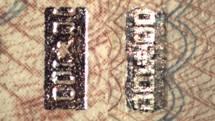 第四種偽造安全線是第二種和第三種的組合,既有燙印開窗,又有實物安全線置于紙張夾層內。(見下圖)