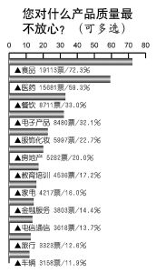 本次民調(diào)發(fā)現(xiàn),如今公眾對(duì)“食品”和“醫(yī)藥”的質(zhì)量最不放心,分別有72.3%和59.3%的人選擇此項(xiàng)。接下來(lái)依次是:餐飲(33.0%)、電子產(chǎn)品(32.1%)、服飾化妝(22.7%)、房地產(chǎn)(20.0%)、教育培訓(xùn)(17.2%)、家電(16.0%)、金融服務(wù)(14.4%)、電信通信(13.7%)、旅行(12.6%)、車輛(11.9%)。