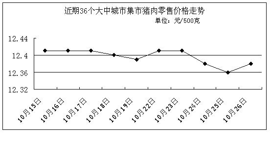中新網10月29日電 國家發改委網站消息稱,據國家發展改革委價格監測中心監測,上周(10.22-10.26,下同)全國36個大中城市豬肉(精瘦肉)集市平均零售價格每500克為12.39元,比上期(10.15-10.19,下同)下降0.08%。其中,12個城市豬肉價格小幅下降,其它城市豬肉價格與上期基本持平或略有上漲。