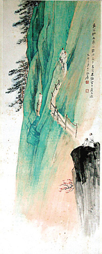 此外,張大千描繪華山長空棧道險峻奇崛的《華山行》,以145.6萬元成交。張大千于1935年游浙江莫干山、洛陽龍門及西安、華山,并為此舉辦了“關洛紀游畫展”,《華山行》即創作于此時。在似青綠山水卻又色不重的大片綠中,畫一長空棧道,著以赭色,十分醒目。空棧上端點兩游者,相背、扶壁而立,一者小心看風景,似不敢再往前;一者已有悔意,正想返身而下,這正應和了畫面的款識“予每度來游,皆中道而返”,或許是大千自己的寫照吧。