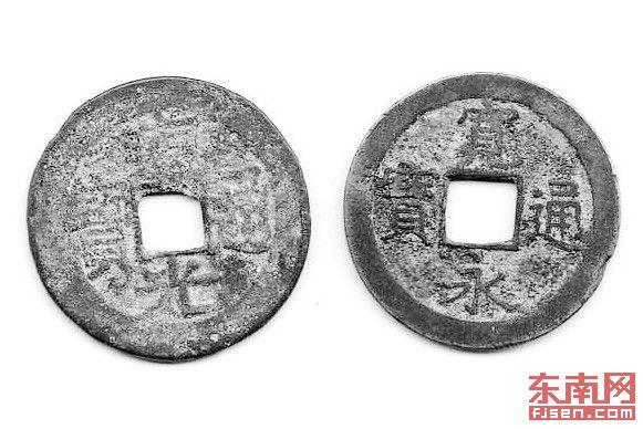 婦女王某今年40歲出頭,是翔安區新店鎮人。昨日7時許,王某跟平常一樣,在退了潮的新店鎮歐厝村海邊附近的灘涂地挖苦螺。一鏟下去,王某意外從灘涂里挖到兩枚綠銹斑斑的古銅錢,便帶回家,經過王某清洗并用細沙打磨,尚能看清字跡,該兩枚銅錢便被王某收存起來。