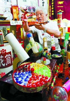 ▲ 走進(jìn)老李在勁松四區(qū)的小家,立刻被桌上、墻上、地上的數(shù)百個(gè)各式各樣的萬花筒所吸引。擺弄著這些心愛的寶貝,老李臉上流露出孩子般的笑容。