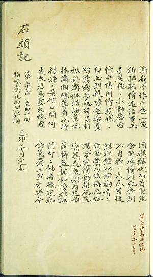 己卯本存四十一回又兩個(gè)半回,此本在31-40回的總目后寫(xiě)有“脂硯齋凡四閱評(píng)過(guò)”、“己卯冬月定本”字樣,故稱。“己卯”為乾隆二十四年(1759),此紀(jì)年應(yīng)是此本底本的紀(jì)年,現(xiàn)存為過(guò)錄本。在這個(gè)過(guò)錄本上,有700余條雙行小字批語(yǔ),另?yè)?jù)此本上“祥”、“曉”字的避諱,研究者比對(duì)《怡府書(shū)目》,考定此本為怡親王允祥、弘曉府上的抄藏本,聯(lián)系到雍正二年御批中曾有“你(指曹頫,雪芹之父或叔父)是奉旨交與怡親王傳奏你的事的……”可知怡親王府與曹家的特殊關(guān)系,此本的底本或許就來(lái)自曹家,其價(jià)值可想而知。己卯本第1-20回、31-40回、61-70回(內(nèi)64、67兩回由后人補(bǔ)抄)原由董康、陶洙所藏,現(xiàn)藏國(guó)家圖書(shū)館;第55回下半至第59回上半現(xiàn)藏國(guó)家博物館。