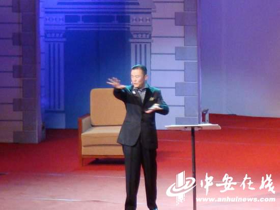 油亮亮的小分頭,筆挺熨帖的黑色禮服,操著“國語”說海派清口,一個(gè)人在臺上連說帶演緊忙活,他就是周立波。9月18日晚,周立波用他“上海話+普通話+合肥話”的精彩表演則讓現(xiàn)場笑聲不斷,掌聲雷鳴。