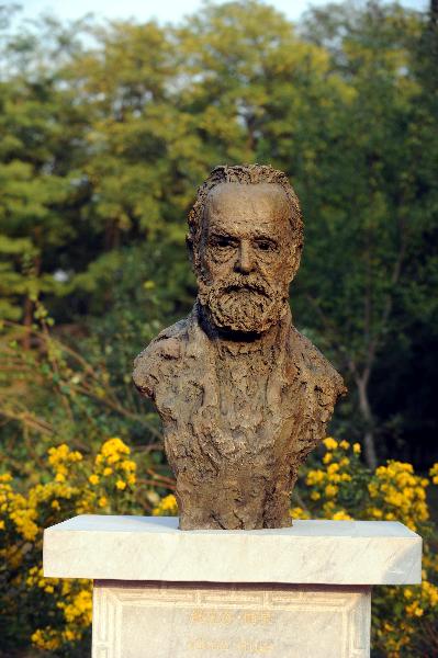 這是10月16日拍攝的雨果雕像。 10月16日,為紀念圓明園罹劫150周年,圓明園舉行雨果雕像揭幕儀式,青銅質地的雨果半身雕像正式與游人見面。雕像高84厘米,寬50厘米,重90公斤,位于大水法遺址東側,在底座上用中法文字鐫刻了說明詞,表達了“永久呼喚文明與和平的尊重,永久紀念人類的正義與良心”的愿望。在雕像南側書型石雕上鐫刻著雨果強烈譴責1860年英法聯軍洗劫圓明園暴行的《致巴特勒上尉的信》。雕像由法中友好聯合會、中國人民對外友好協會和法國東方華人協會共同捐贈,法國雕塑家娜什拉·凱努制作。新華社記者羅曉光攝