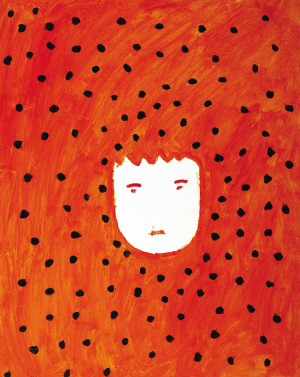 郭海平問記者:“如果是你,會(huì)如何表達(dá)‘掙扎’的抽象精神?”隨即他讓記者看了張玉寶的作品:沖擊力極強(qiáng)的橘紅色背景上,被扎上了無(wú)數(shù)個(gè)錯(cuò)亂且刺眼的黑點(diǎn),它們環(huán)繞在一個(gè)人頭四周,人臉表情有些呆滯。色彩強(qiáng)烈的反差,讓人感覺周圍恐怖的背景,隨時(shí)可能將人頭吞噬,人頭似在苦苦掙扎。整個(gè)畫面是那么干凈,但內(nèi)涵卻非常豐富。無(wú)論如何,你都不能猜到這是一個(gè)未經(jīng)任何繪畫訓(xùn)練的人畫出來(lái)的東西。