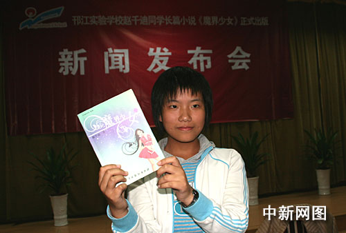 中新網(wǎng)揚(yáng)州10月17日電(記者崔佳明)10月17日下午,江蘇省揚(yáng)州市邗江實(shí)驗(yàn)學(xué)校舉行新聞發(fā)布會(huì),宣布該校初三學(xué)生趙千迪的十八萬(wàn)字長(zhǎng)篇小說《魔界少女》第一季終于于今年二月創(chuàng)作完成,并于八月份由中國(guó)戲劇出版社正式出版發(fā)行。揚(yáng)州市作家協(xié)會(huì)主席正式宣布,吸收趙千迪入會(huì),成為該市年齡最小的作家。