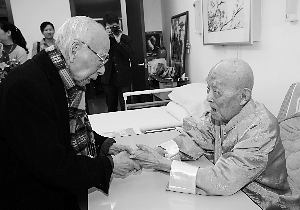 昨天下午,著名學者、漢學大師饒宗頤專程來到解放軍總醫院,看望北大資深教授季羨林。饒先生送上題字“松高唯岳”,祝愿季老身體健康。98歲高齡的季羨林與92歲高齡的饒宗頤在學界被尊稱為“南饒北季”,兩人同為當今學界泰斗。