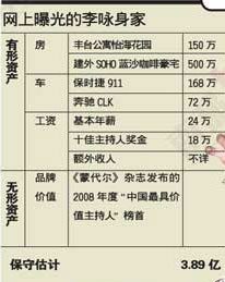 在06年被曝光的一份主持人走穴身價(jià)清單上,李詠以18萬(wàn)的身價(jià)高居榜首。而后他代言某地板品牌的消息也引起爭(zhēng)議,節(jié)目組聲稱李詠只是跟老板合影,是品牌自己在炒作而已,堅(jiān)決否認(rèn)做了廣告,再加上名下價(jià)值百萬(wàn)的保時(shí)捷跑車,李詠這個(gè)名字的含金量當(dāng)然讓人咋舌。在采訪中,與先前的韓喬生一樣,這些主持人都說(shuō)自己沒(méi)什么錢(qián),一個(gè)月也就一萬(wàn)來(lái)塊,跟明星完全沒(méi)辦法比。話音剛落,李詠的名字又赫然出現(xiàn)在最有價(jià)值主持人排行榜榜首,可能是受金融危機(jī)影響,縮水1.1億,但總價(jià)也有3.89億。