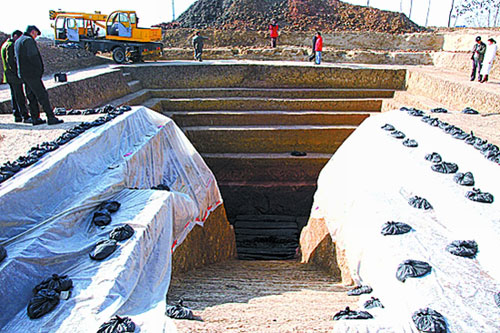最大古墓發掘現場,厚厚的土層已被分成了7級收縮臺階。據介紹,這個大墓地下部分深達7米多,外開口占地面積達52平方米,墓道面積達22平方米。記者發現,大墓最后3級臺階下,土層由黃變赭紅。專家稱,赭紅色土層其實不是真正的土層,而是尚未完全形成的紅砂巖,遇水比較軟,但風干后就成了風化石。因此可以想象,當年修墓時,棺槨下部的空間是由人工開鑿出來的,四壁上仍能看到明顯的開鑿痕跡。