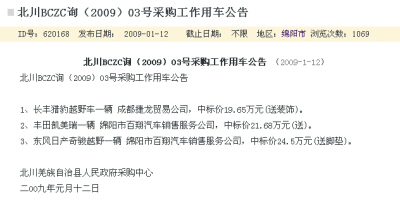 網友在《北川政府110萬采購豪華越野車》的帖子中,展示了一張名為“北川采購工作用車中標公告”的截圖,而韓寒在其博客里引用“來自綿陽政府采購網”的資料,列舉綿陽購買的10萬余輛車一覽,所有越野車的價格都在10萬到100萬之間。其中有長豐獵豹、東風日產奇駿、豐田普拉多等10萬以上的越野車,價格在50萬以上的車就有4輛,其中就有豐田普拉多VX4.0導航版,價格62.60萬元。另外還不乏像蘭德酷路澤頂配這樣的百萬豪車,所有車的總價值超過400萬。