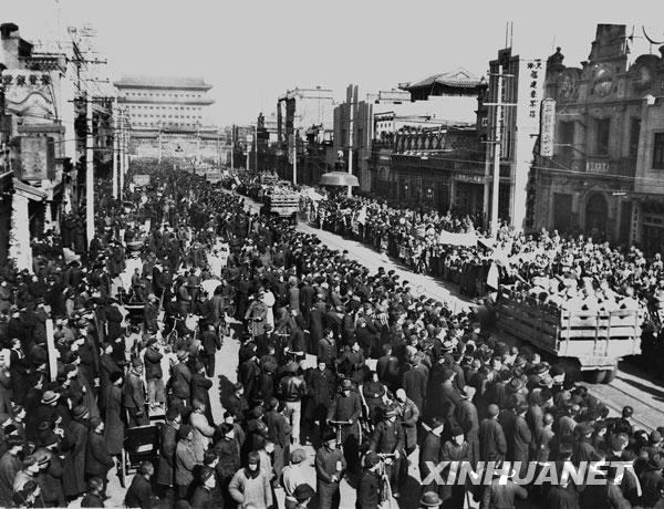 1949年2月3日北平入城式。人民解放軍在萬眾歡呼中進入前門大街(新華社資料圖)。