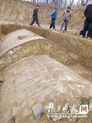 昨天下午,記者來到位于雨花臺區鐵心橋附近一個叫馬家店的村落,這里正在進行京滬高鐵的勘探施工。幾名工人告訴記者,他們負責在此日夜看護古墓,“因為古墓被發現時,墓門已經被聞風而來的盜墓賊破壞了,東面的一座古墓發現有人進去過的痕跡。”記者爬上西面的一座古墓,只見考古人員已經挖出古墓的地表范圍,大部分墓頂已經露出土層。考古人員說,這座古墓比較大,外形保存基本完好,長約有8米,寬約3.5米,近幾日就準備打開墓門。”記者看見墓室的圈頂上有一堆看似被動過的亂磚,大約80厘米見方,考古人員介紹說,應當是過去盜墓賊留下的“杰作”。