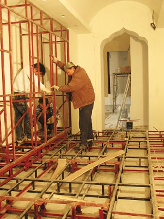 隨后,記者從左邊的長廊向大成殿的后方――冶山坡邁進。高大的崇圣殿外一片繁忙景象,寬大的平臺上,10多名工人正在搭著鐵架,這里將是開幕儀式的主要場地,28日那天,來自全世界60個國家和地區的佛教高僧和各界貴賓將再次舉行一個特殊的盛典。而這處崇圣殿將是阿育王塔等文物的展覽圣地。
