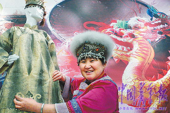在今年2月北京舉辦的中國非物質文化遺產傳統技藝大展上,這件魚皮衣服吸引了無數眼球。頭戴雪兔毛魚皮帽,腳穿魚皮靴子的尤文鳳,坐在展臺前,不厭其煩地回答著觀眾的問題。
