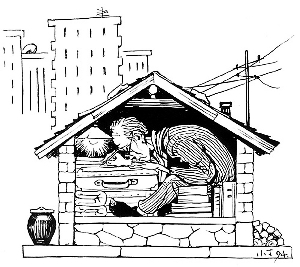 陳四益回憶中,丁老有著老一輩知識分子的風骨,他說:“他的生活一直很艱苦,但是他從來不挑挑揀揀。”當年,丁老師給巴金等作家的書配插畫時,正在美術館做給畫貼標簽的工作,他就是在那些標簽紙上畫書的插圖的。丁老師的住房條件一直十分艱苦,房子很小,最后屋子里東西堆到放不下,他就只好自己去租了一間老房子搞創作。(如圖丁聰漫畫《書中沒有黃金屋》)