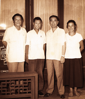 1961年7月初,我們在北京工作的堂兄爾輝結婚,因為他祖母和母親都在淮安老家,伯伯和七媽為他們在西花廳舉辦了婚禮,飯前參加婚禮的三十多人一起照了相,我去晚了沒趕上。飯后,七媽拉住我說:“你來晚了,沒趕上照相,又要參軍走了,來和伯伯照個相吧。”維世姐姐說:“金山也來晚了,一起照吧。”于是有了上面的這張照片。
