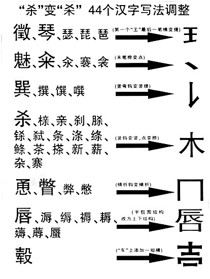 一些網友認為,調整漢字如果只注重美感,就把傳統的東西丟掉了。比如“殺”字,本身下面像鉤像矛,有“殺氣”,下面改成“木”后,感覺就變了。專家解釋,這次調整字形有些地方參考了臺灣的字形。